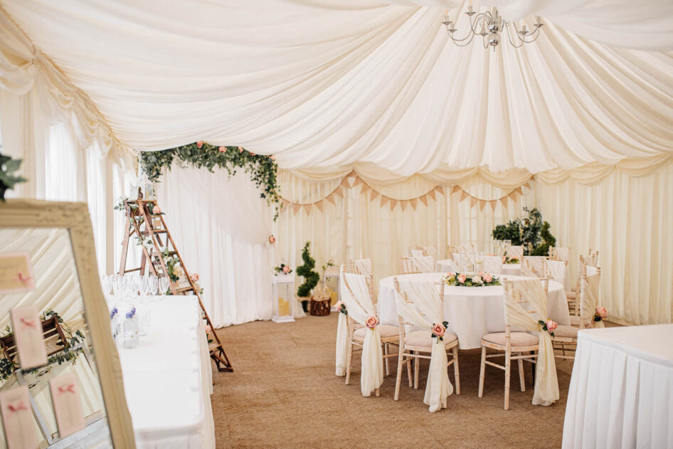The spacious marquee, draped in elegant fabric, provides a versatile space for your wedding photos. Whether it's day or night, the marquee's ambiance adds a touch of magic to your pictures.